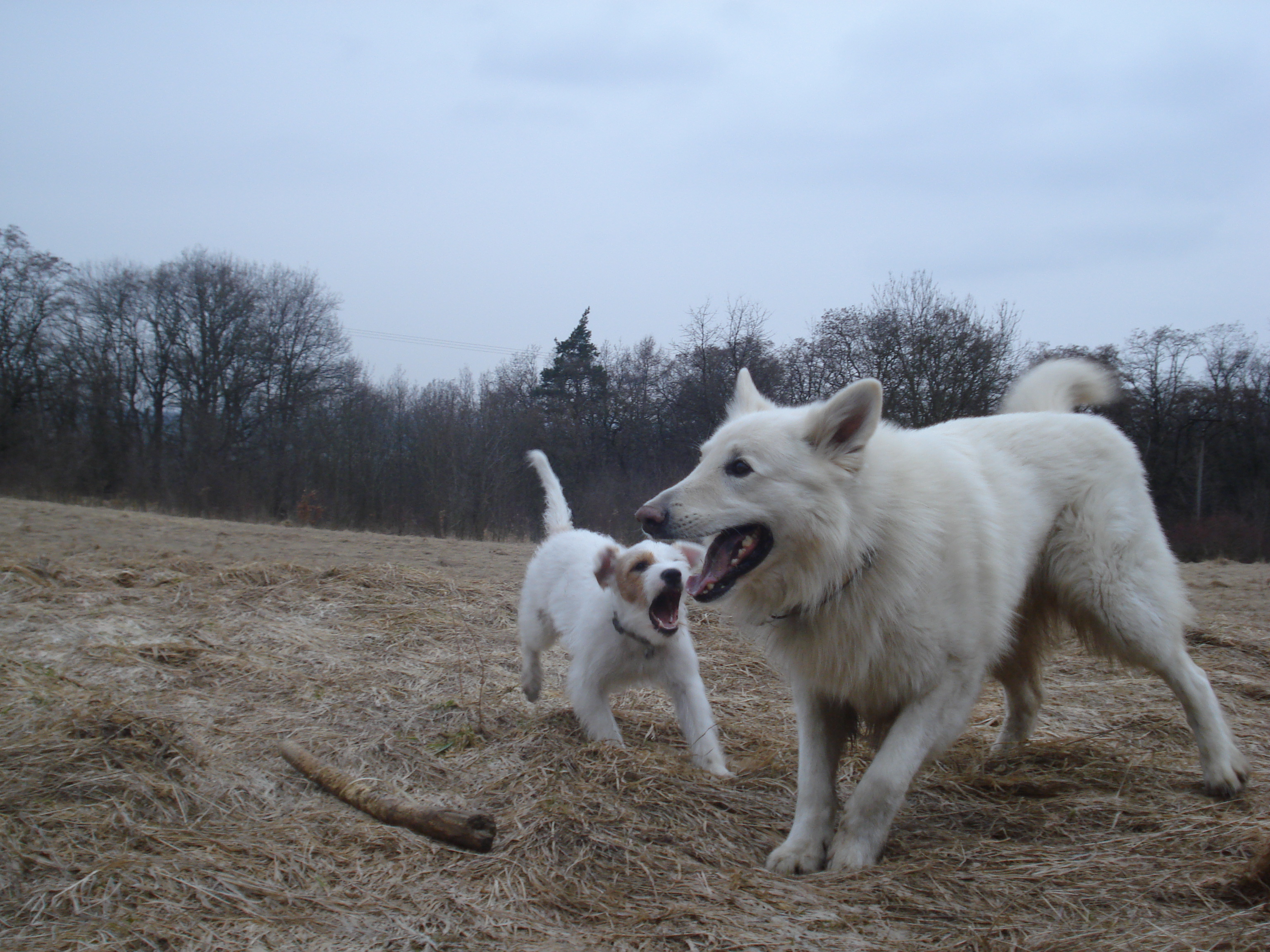 Celaskónek si na mě, ale, byl nucený zvyknout (hehe), prostě jsem se mu najednou vetřel do života a tak mě musel vzít na milost. Teď dokonce spolu aportujeme - to třeba jako nechápu... když běží on pro svůj aport, letím s ním, no a z 90% jsem u aportíku první, ale aby mu to nebylo líto, tak mu ho nikdy nevemu, počkám tu setinku sekundy na něj a pak s ním běžím zpátky (panička - zaprvé ten velký klacek neunese a za druhé má z Culeho respekt, takže žádné "aby mu to nebylo líto:). Na druhou stranu, na můj aportík Culda nešáhne a ani semnou neběhá, protože moc dobře ví, že jsem strááášně rychlej, a vzít mi můj aportík, tak je po něm. (panička - Cule není blbý... běhá jen pro své aporty, já mu dám "je po něm" - to pak vypadá tak, že Cule má Beríse aport a Berís lítá kolem a ječí jak na lesy a Cule ho s pobaveným výrazem provokuje s aportem v hubě:). Ale teď vážně, Celaskónek je strašně fajn, lítáme spolu v lese, plašíme bažanty v křoví (to mě naučil), a vždycky mě uvrtá do nějaké blbosti a pak to od paničky schytám. Do misek na papáníčko si lezeme oba dva a vodu chlastáme na střídačku z obou misek, je to prostě kámoš. No a když to někdy přeženu, tak mě umí usměrnit, no a pak to nejlepší - za to, že na mě vyjel, ho zas usměrní panička a páníček Culdy se pak pustí do paničky - no není to prča? Já se u toho neskutečně bavím :) Berry