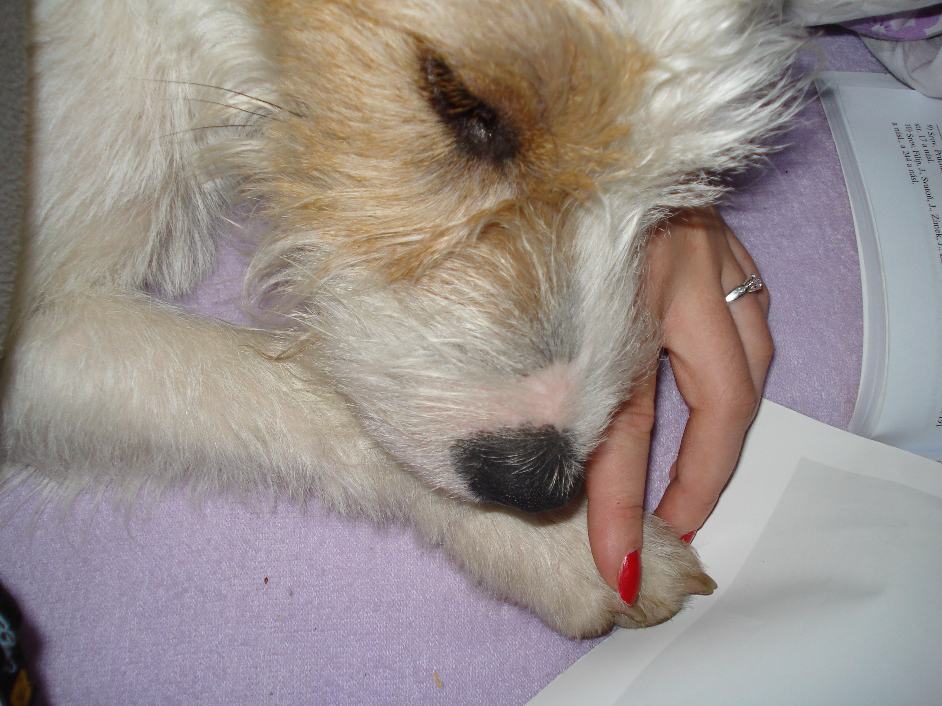 Naše cesty se skřížily vlastně úplně náhodou, a to v březnu 2010, kdy mne panička, tehdy jako 14ti denní štěně uviděla na fotce. Já v tu dobu ještě ani neviděl, ale panička už měla dávno jasno - chtěla Parson Russell teriéra, psa, hladkosrstého a černo-bíle flekatého. A má mne. Jak se to vlastně stalo? Čert ví, když se na mne jela začátkem dubna podívat, vrhly se na ni všechny moje ségry, já se na ní jen koukl, ale zajímavější mi přišel kus deky, ale nojo, když si mě chtěla pochovat, tak jsem jsem tu deku na chvilku nechal no, ale byl jsem svůj - proč bych se měl mazlit s někým koho vůbec neznám? Ten cíp deky byl fakt daleko zajímavější... Panička se do mně tehdy z nepochopitelnýho důvodu zamilovala, černý flek jsem neměl ani jeden a k hladkosrstému Parsonovi jsem měl ze všech pěti štěňátek nejdál, byl jsem taková chlupatá, broken kulička. 22.4.2010 panička přijela znovu, tentokrát jsem se k ní už i nic netušící rozeběhl. A pak se to stalo - normálně si mě odvezla! Trošku šok, co si budem povídat, zaplakal jsem si v autě jen prvních pár minut a pak už jsem střídavě koukal z okýnka, mazlil se a spinkal a těšil se na úplně novou etapu svýho života.